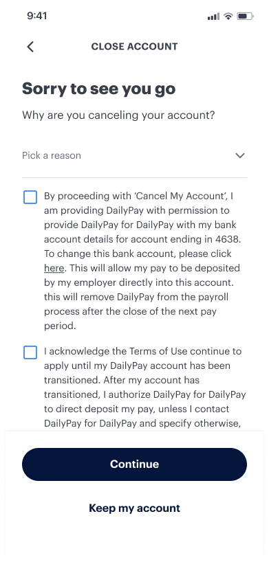Sorry to hear you’re thinking of leaving DailyPay. Just so you know, even if you’re now in a job that doesn’t offer DailyPay, you don’t have to close your account. You can also still keep your DailyPay Card account even if you don’t use your DailyPay earnings account anymore.